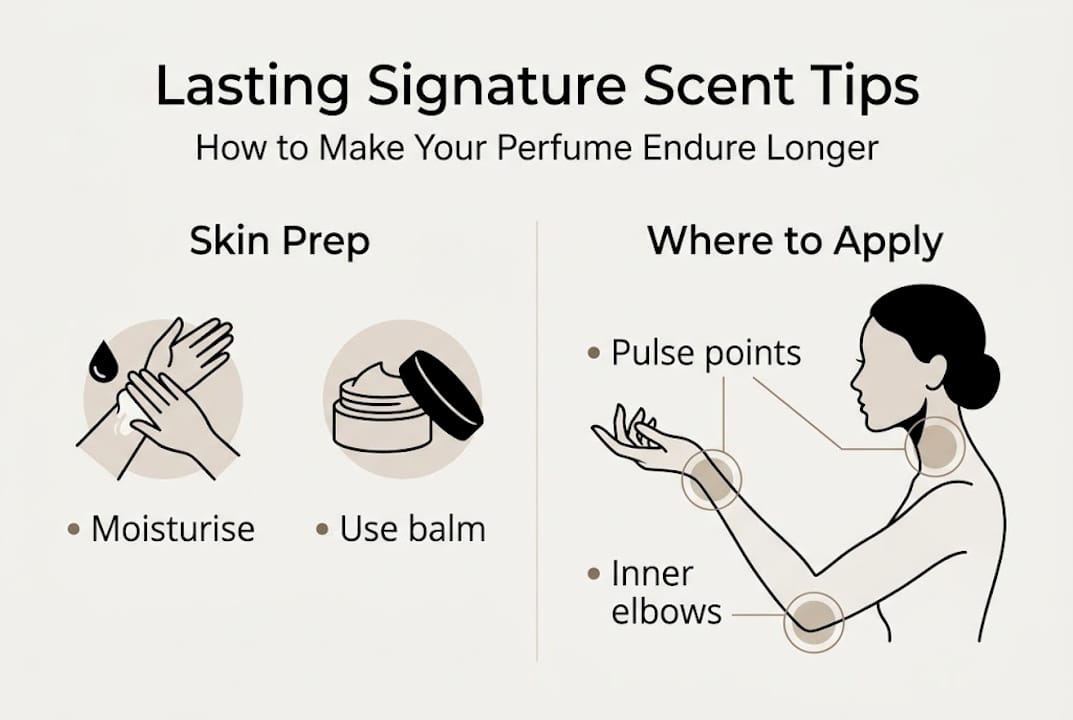 Hydrated skin holds fragrance molecules close to the surface, allowing the top, middle, and base notes to unfold at their natural pace. Dry skin, on the other hand, absorbs the alcohol carrier almost immediately, pulling the scent away before it has any chance to develop properly. Moisturising before applying perfume is one of the most consistently recommended tips for enhancing longevity, and it genuinely makes a measurable difference.