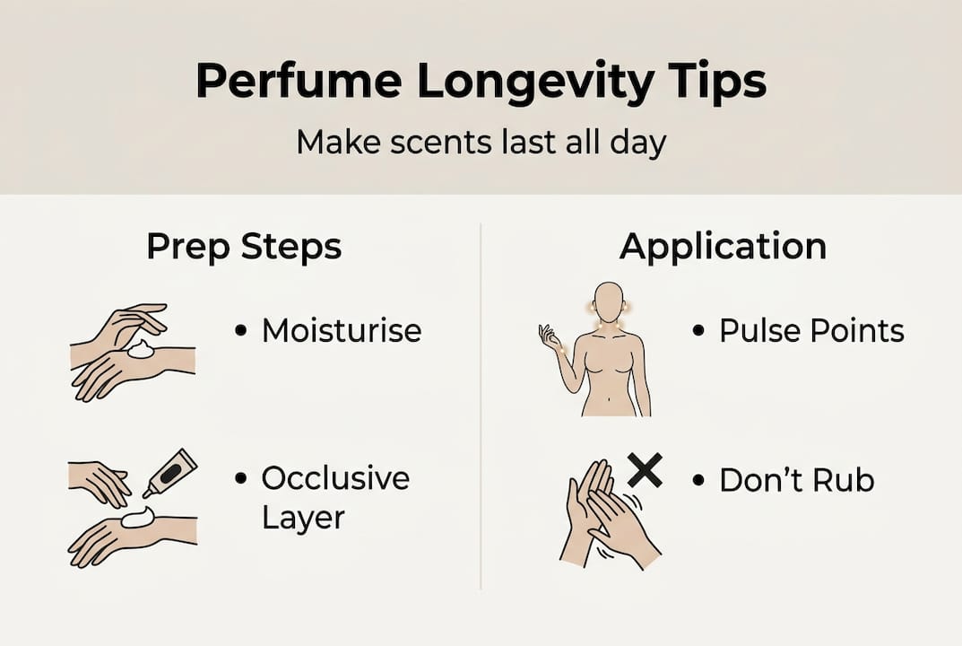 - Applying perfume to pulse points and avoiding rubbing extend the scent's lasting power.